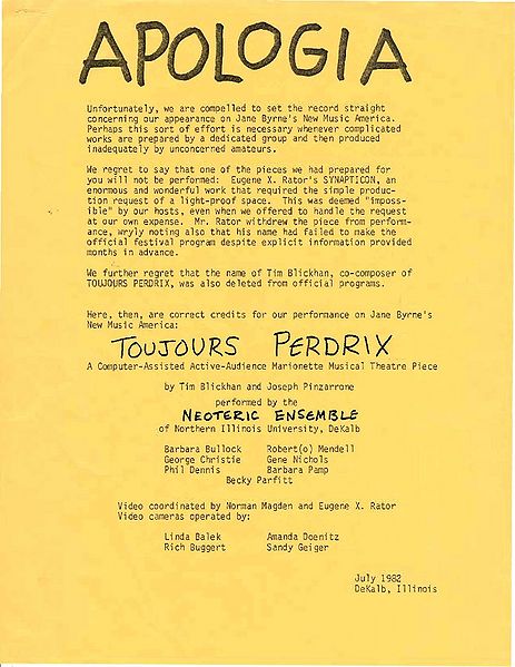 Revision as of 22:48, 5 February 2012 by Gongmaster (talk | contribs) (Program, Toujours Perdrix; Plain paper copy; July, 1982; © 1982 the Neoteric Ensemble; Collection of Tim Blickhan; Used with permission)