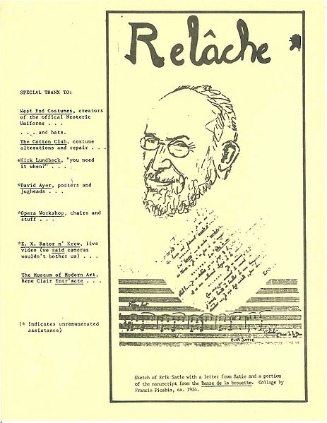 Revision as of 23:36, 5 February 2012 by Gongmaster (talk | contribs) (Program, "Relâche"; Plain paper copy, 8 1/2 x 11"; Neoteric Ensemble; © 1986 Neoteric Ensemble; Collection of Tim Blickhan)