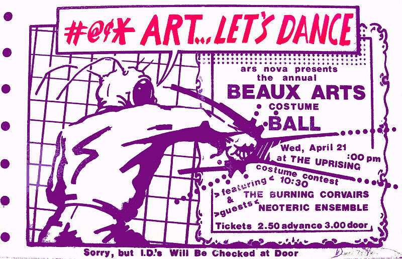 Revision as of 21:42, 11 February 2012 by Gongmaster (talk | contribs) (Poster, Ars Nova, "Beaux Arts Ball" April 21, 1982. Collection Tim Blickhan.)